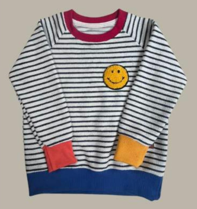 Casaco Raglan Smile gola vermelha com punhos amarelos,branco com listras azul finas.
